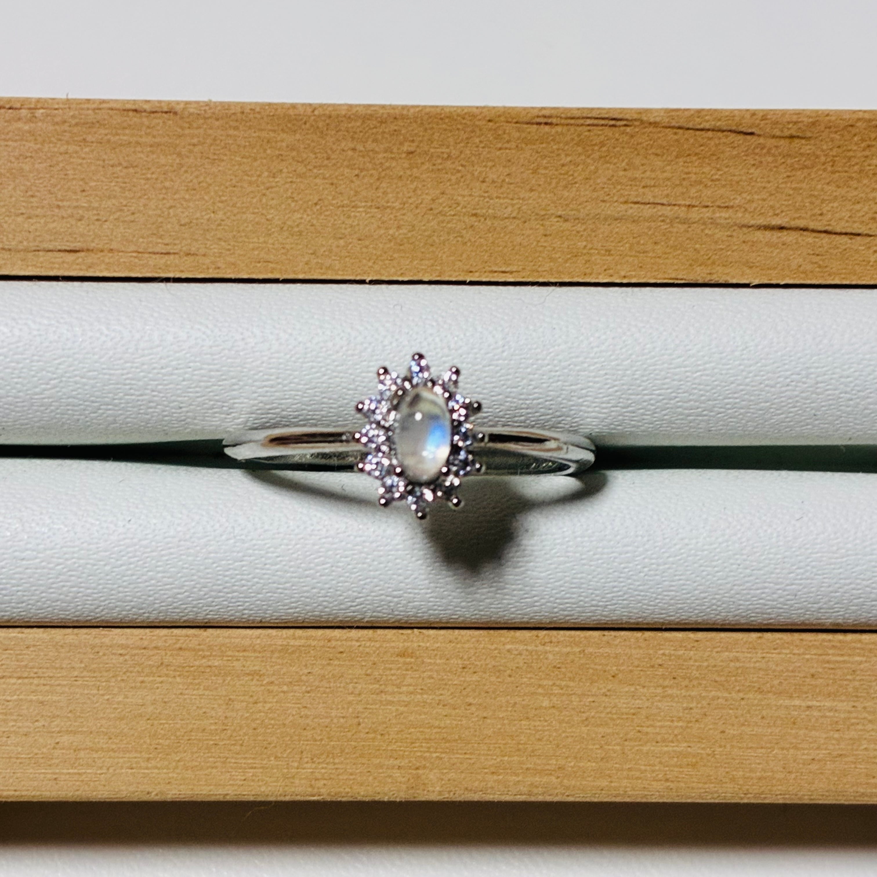 ブルーシラーの美しいムーンストーンのまわりにはジルコニアが12石。細身ながらも綺麗なリングは普段使いでも邪魔になりません✩.*˚