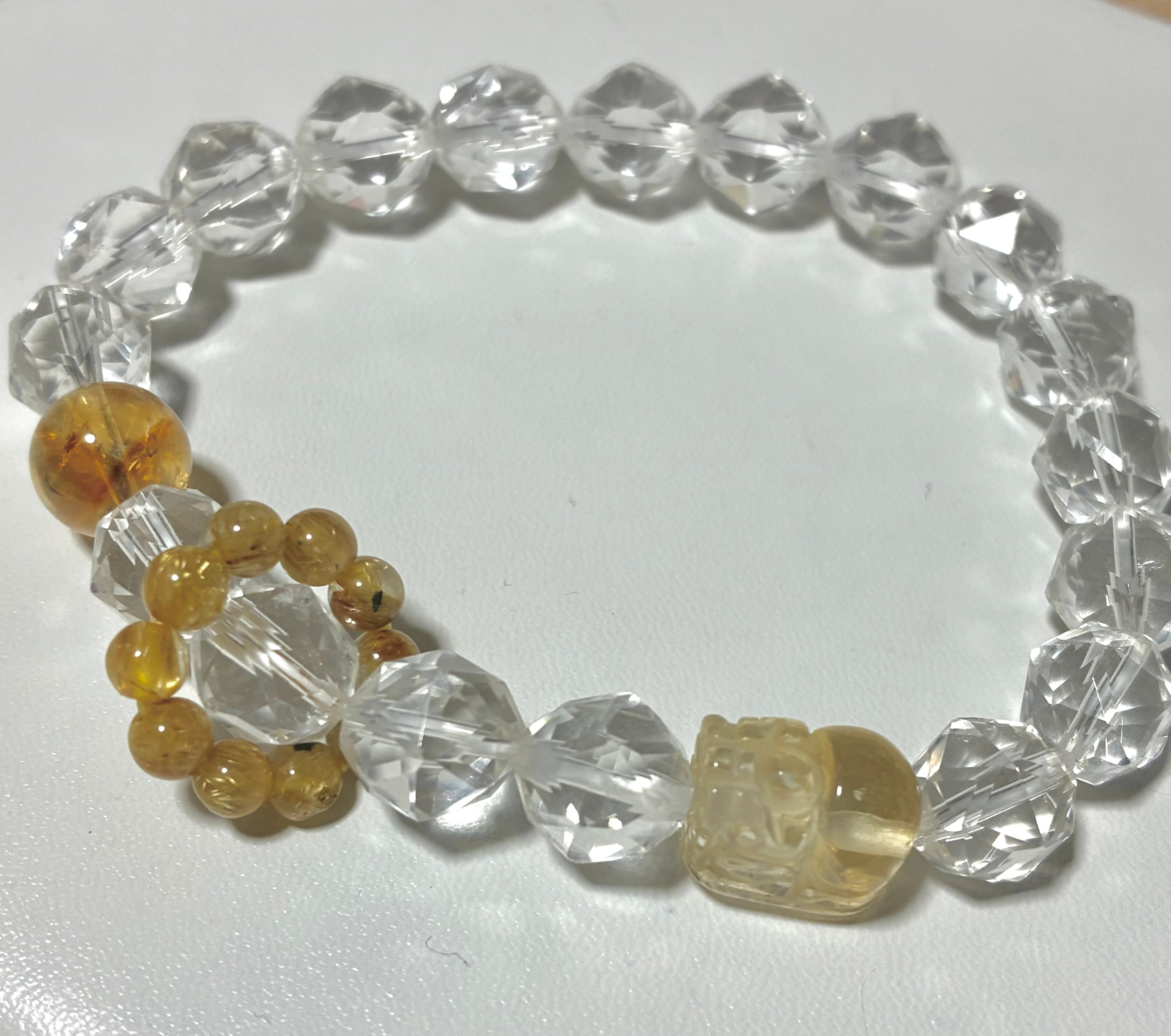 光を反射してキラキラと輝くスターカットの天然水晶に、綺麗な虹の入った丸玉シトリンと淡いグラデーションシトリンの貔貅パーツ、しっかりと針の入った小粒のルチルクォーツリングをあわせたデザブレとなっております*.+゚