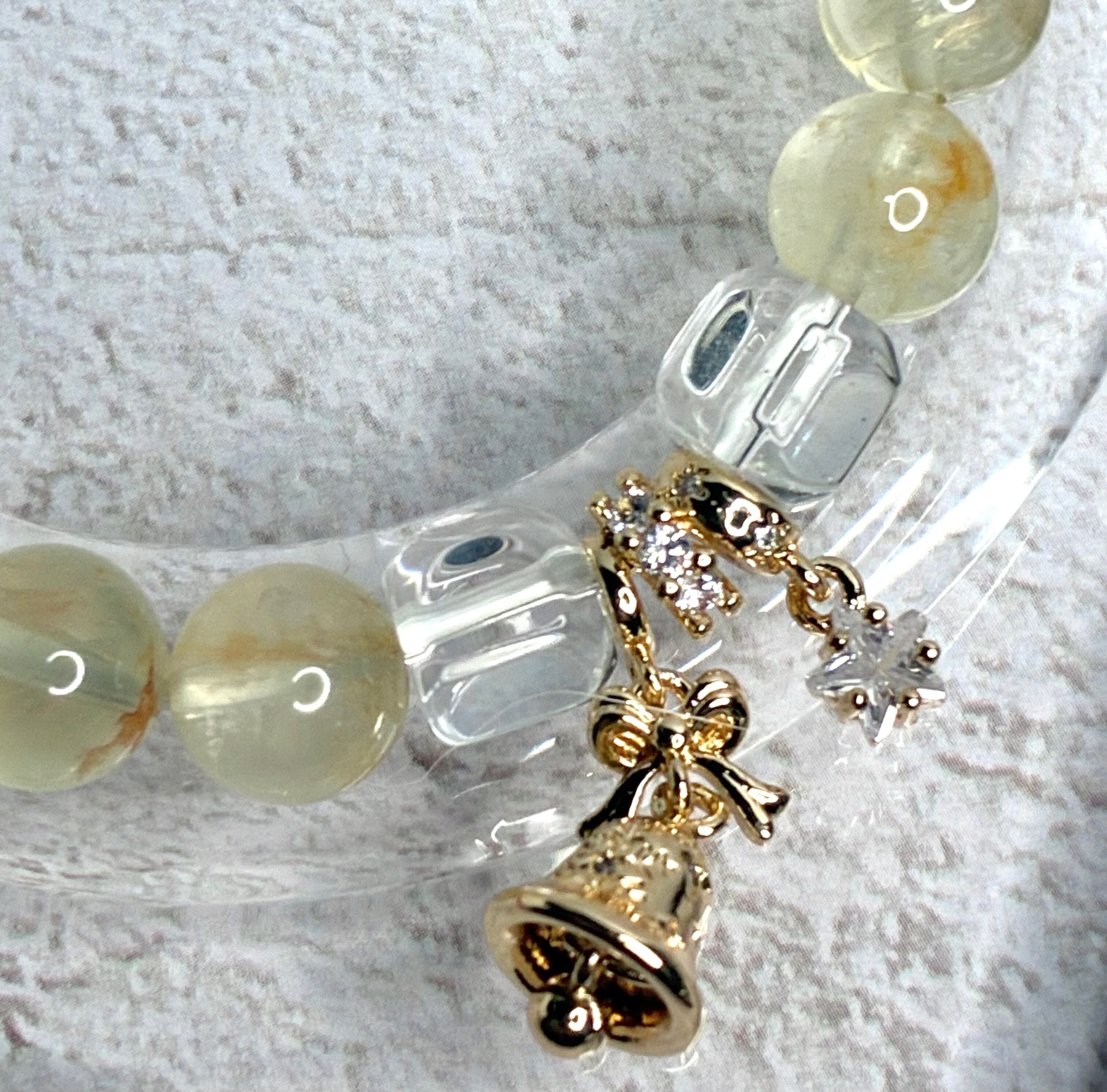 大玉のローズクォーツをセンターに、ミルキーアクアマリン、ライモナイトインレモンクォーツ、アイスカット水晶を可愛らしいベル&星のチャームと組んだブレスとなっております♡