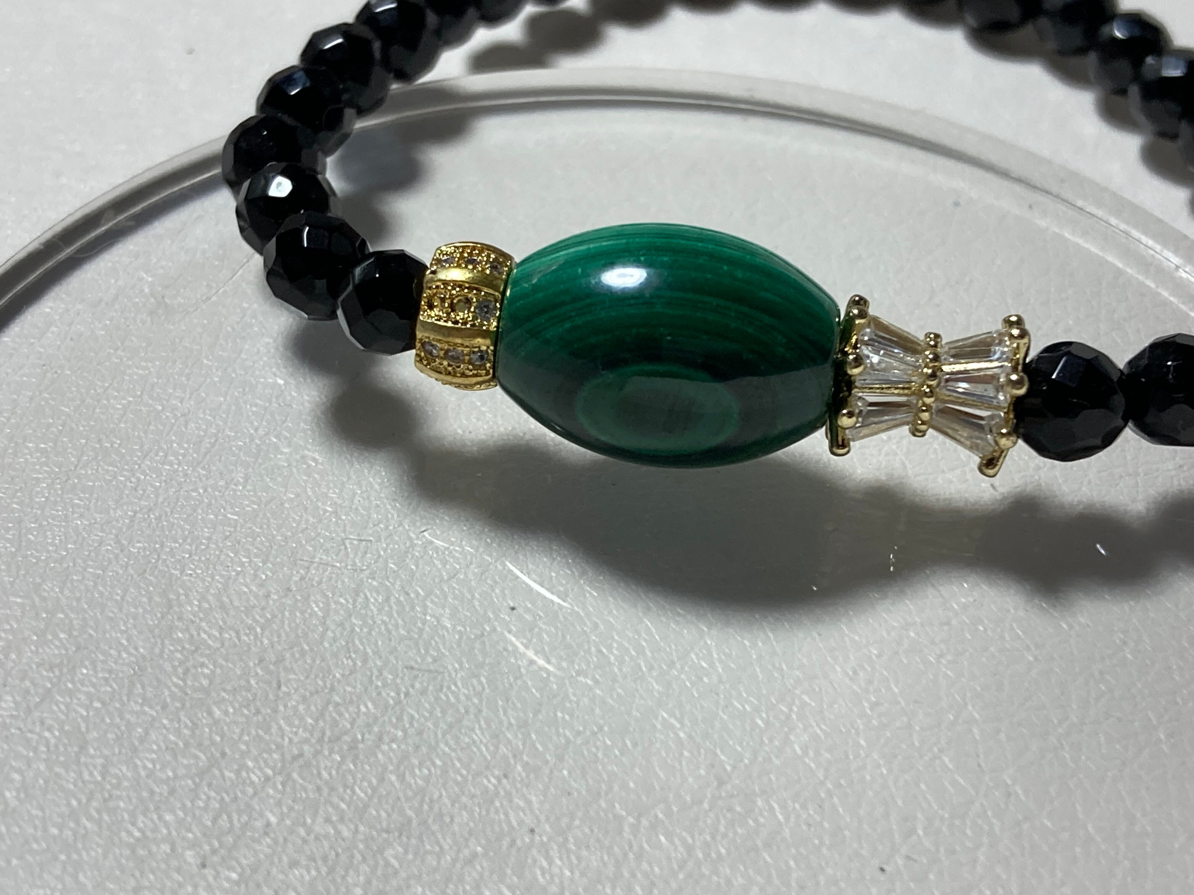ストレスの軽減と厄除け効果の優れたマラカイトと、こちらも厄除け効果の高いオニキスを合わせたデザインブレスに仕上げました。