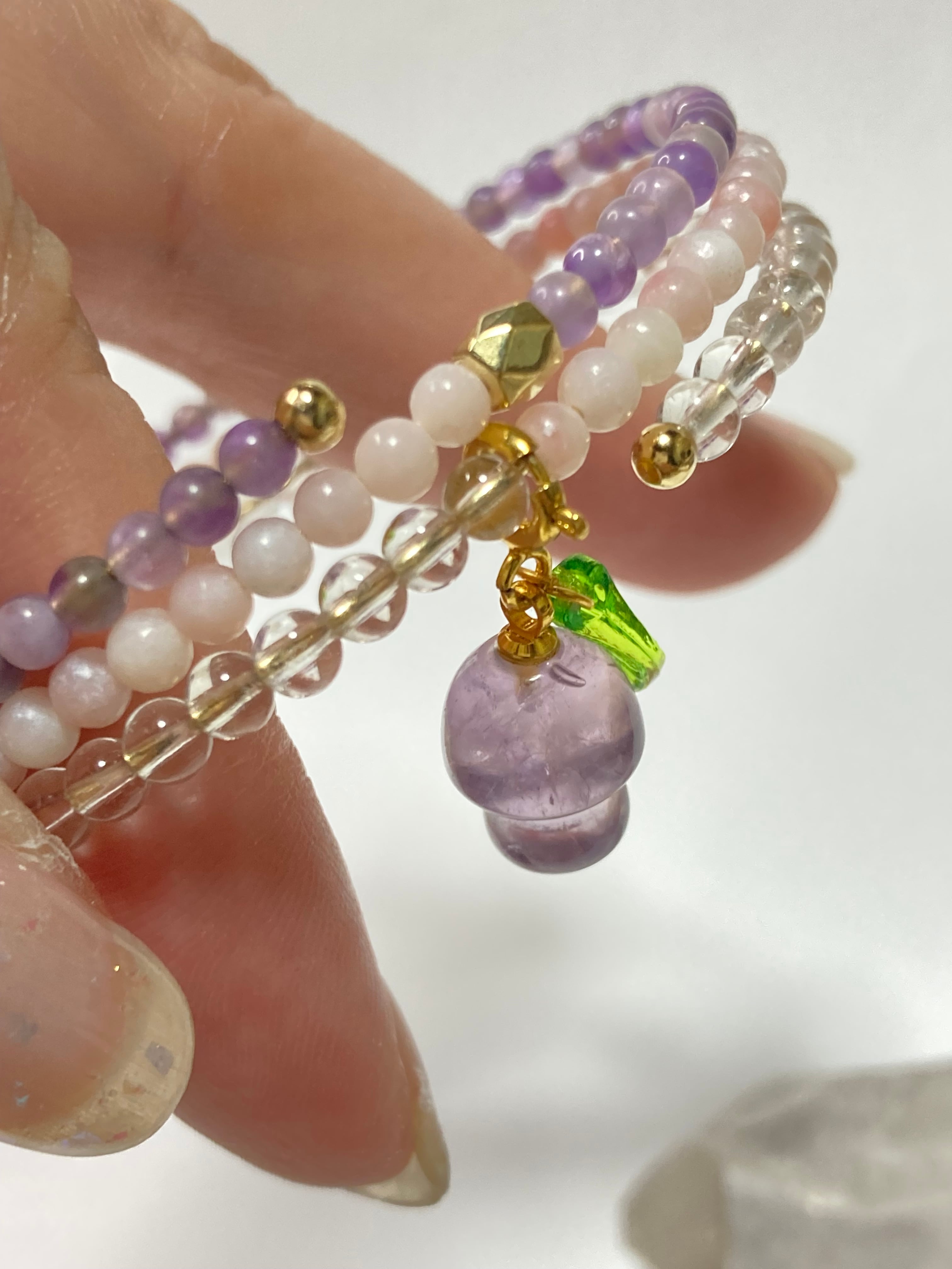 3mm玉のアメジスト、ピンクオパール、水晶をあわせたワイヤータイプの3連ブレスに可愛いアメジストのキノコのチャーム付きです♡